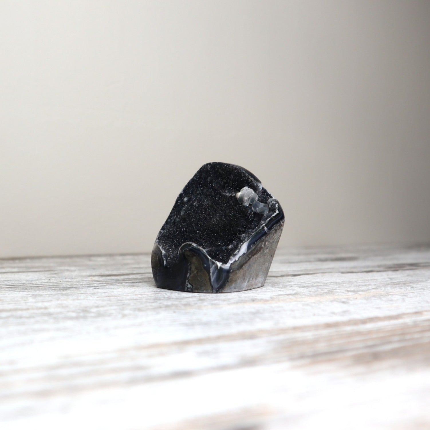 - **Black Amethyst Cave (Cut Base):** approx. 6cm tall / 211g – richly coloured with glittering druzy and a stable base