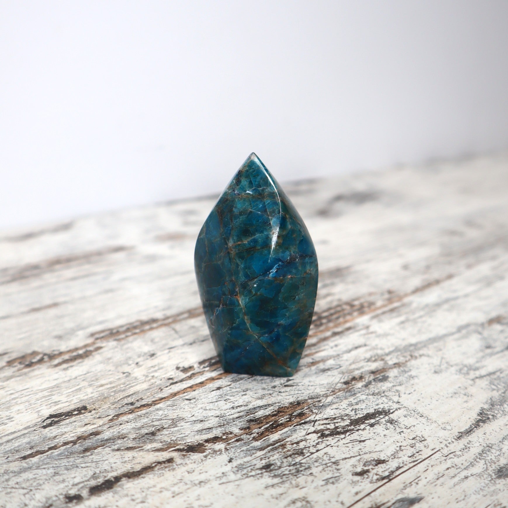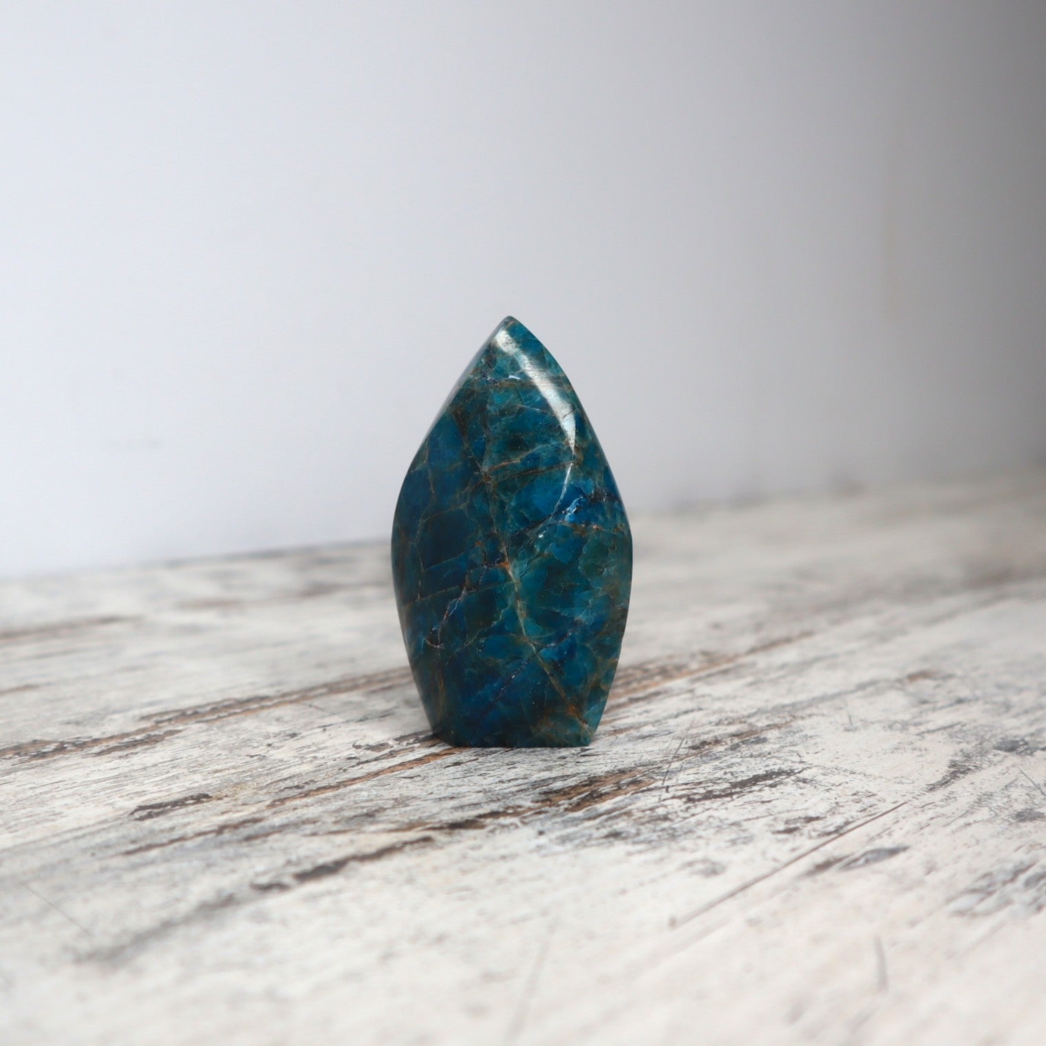 Polished Blue Apatite flame – approx. 7cm – vibrant shades of oceanic blue with flashes of teal and natural marbling