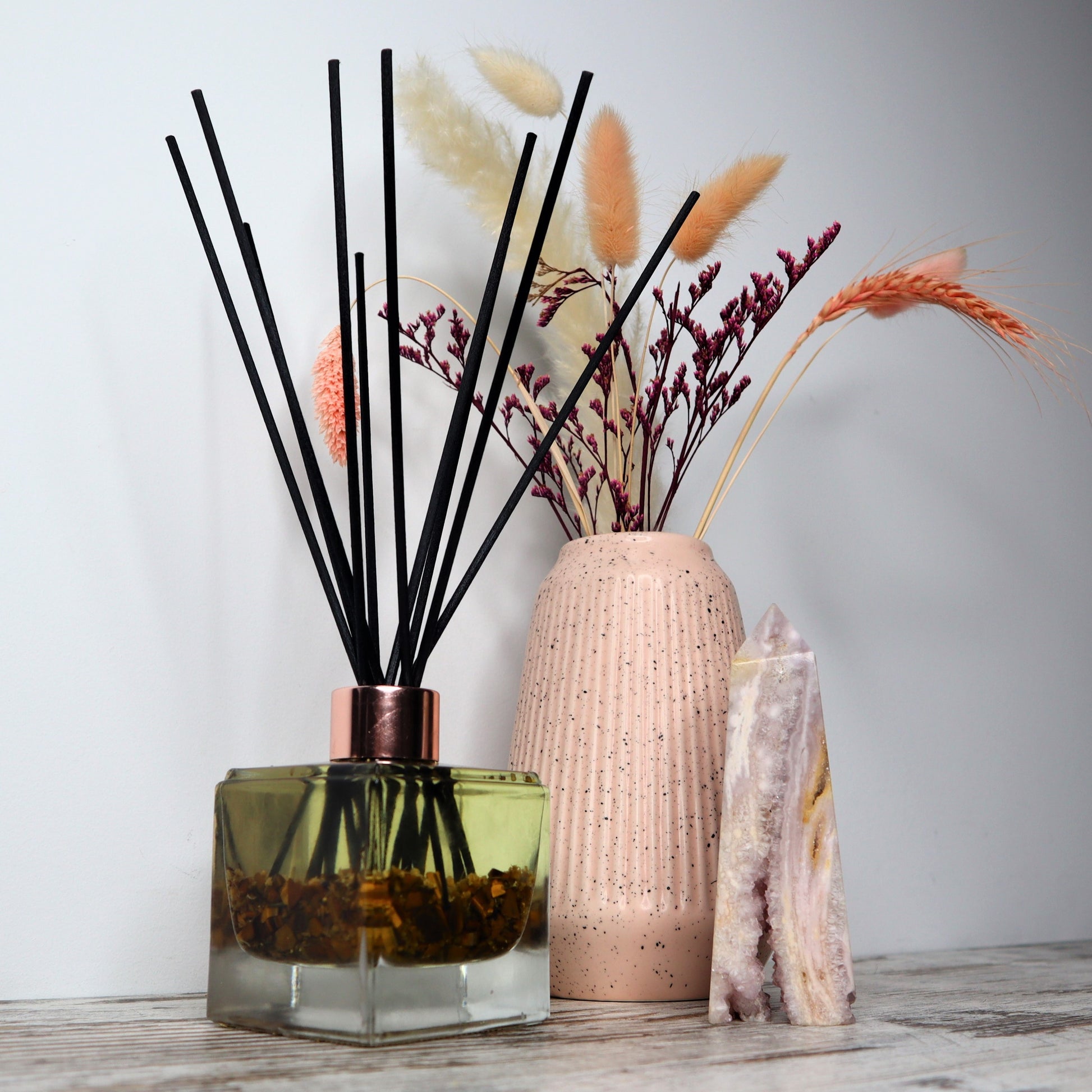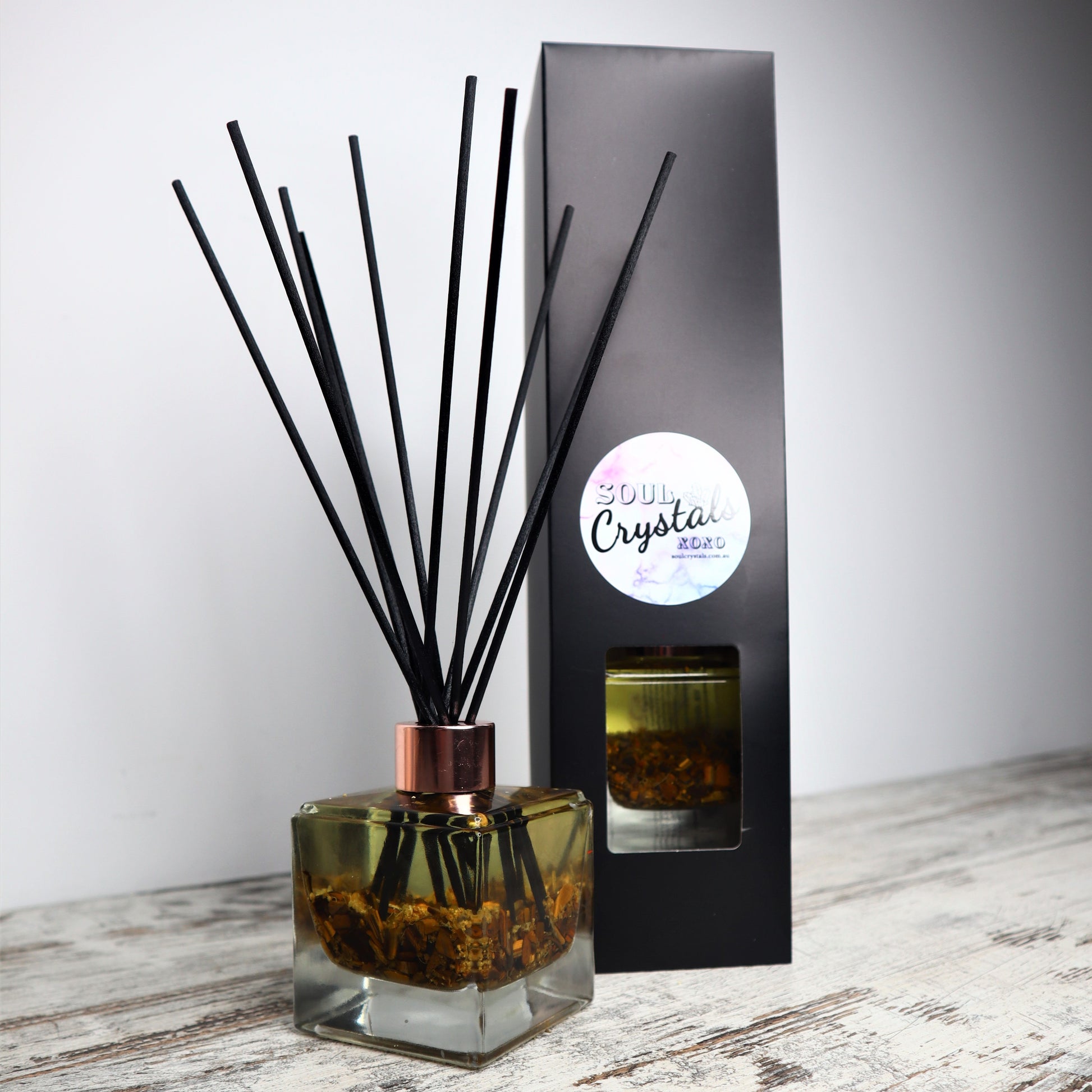 Infused with a magnetic blend of Blood Orange, Grapefruit, Nutmeg, Clove, Leather, and White Wood, this diffuser fills your space with an aura of strength, clarity, and focused motivation. Dried Elder Flowers add a grounding herbal touch, while Tiger Eye crystal chips sit at the base — infusing the blend with protective, empowering energy that inspires bold action and unshakable confidence.