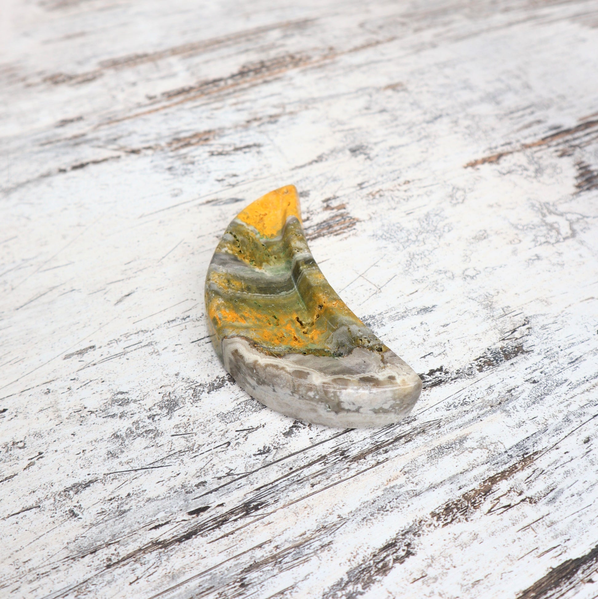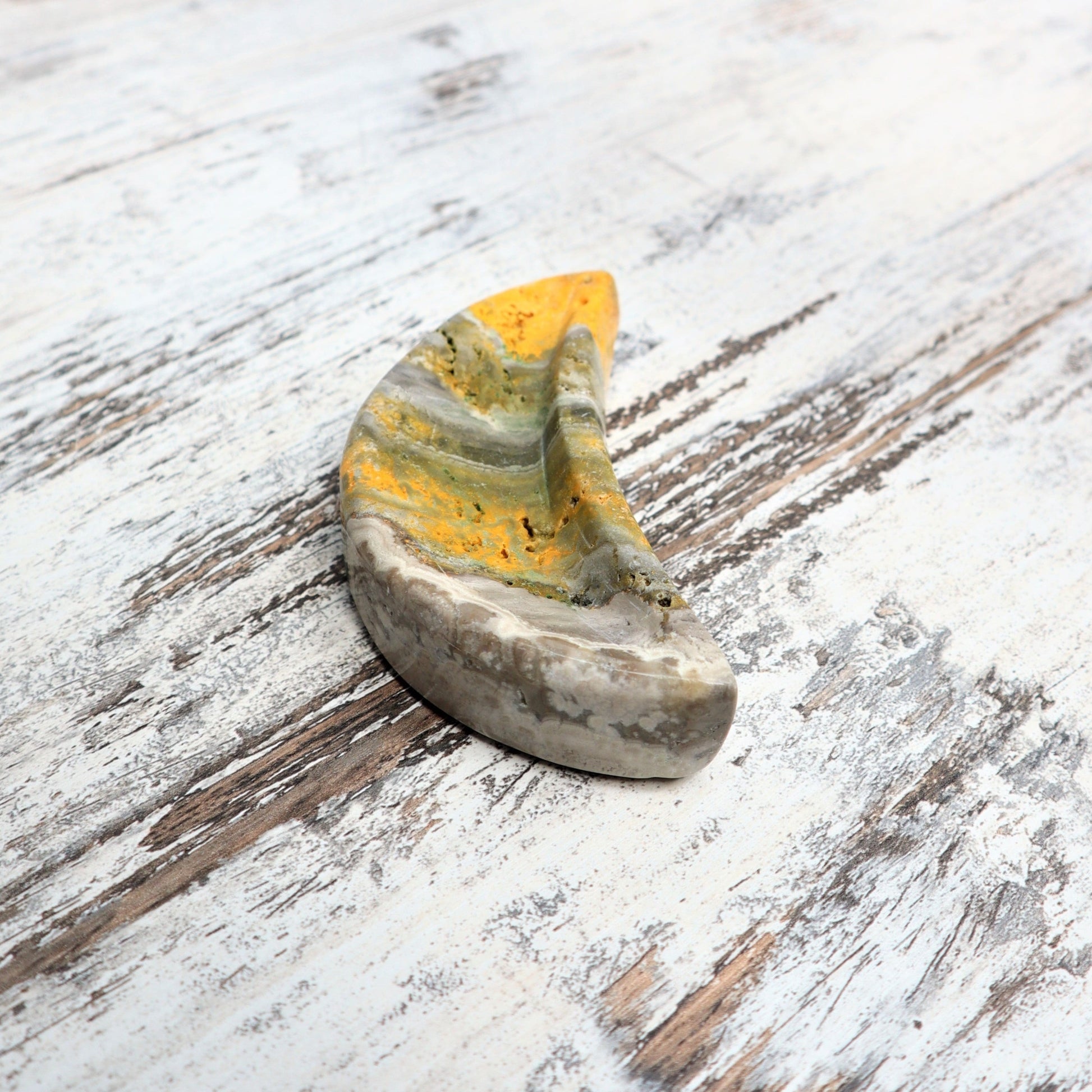 This Bumblebee Jasper Moon Bowl bursts with soul-stirring colour—radiant golden ochres ripple through earthy greens, silvers, and smokey greys like a miniature energy portal carved by nature herself. With its light-filled layers and dreamy moon shape, this bowl is made for those seeking a little magic and momentum. 🌕