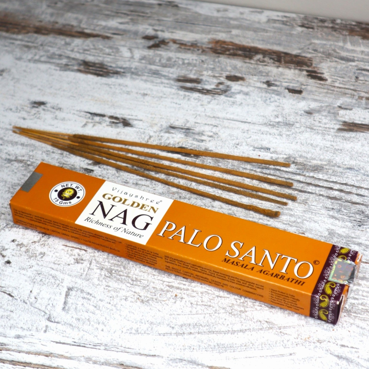 Golden Nag Palo Santo Incense is inspired by the sacred wood of South America, known for its powerful purifying properties and spiritual protection. This masala-style incense beautifully blends the essence of Palo Santo with natural resins and herbs to create a warm, uplifting aroma that clears stagnant energy and welcomes divine peace.