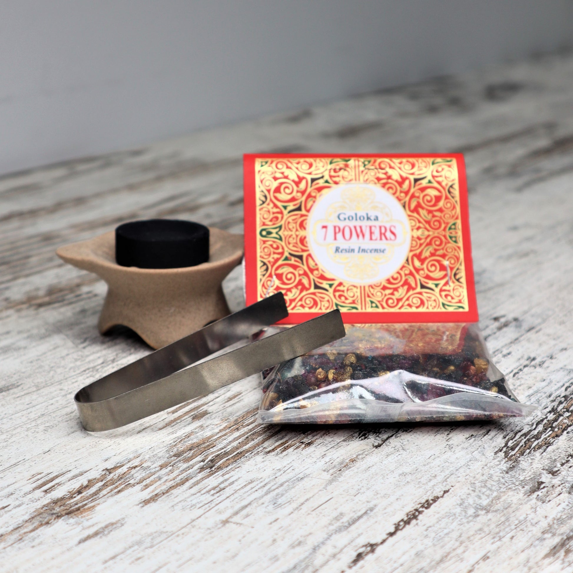 Place a charcoal disc in your burner or cauldron (any heat-proof bowl can be used) and then light the disc. Once it is red hot and goes grey around the edges, carefully add the resin on top and enjoy the magical smoke and incredible aroma that will fill your space.