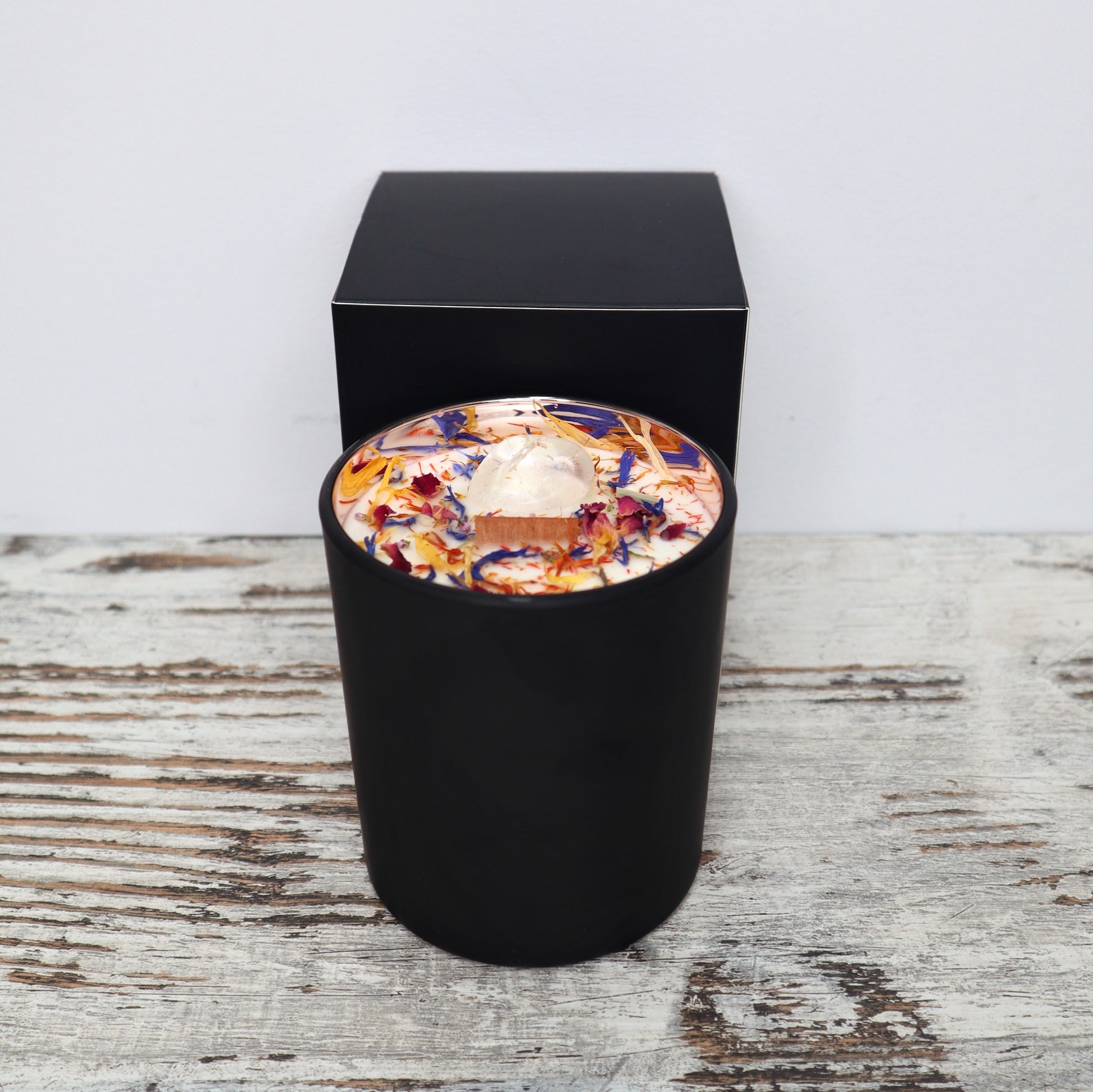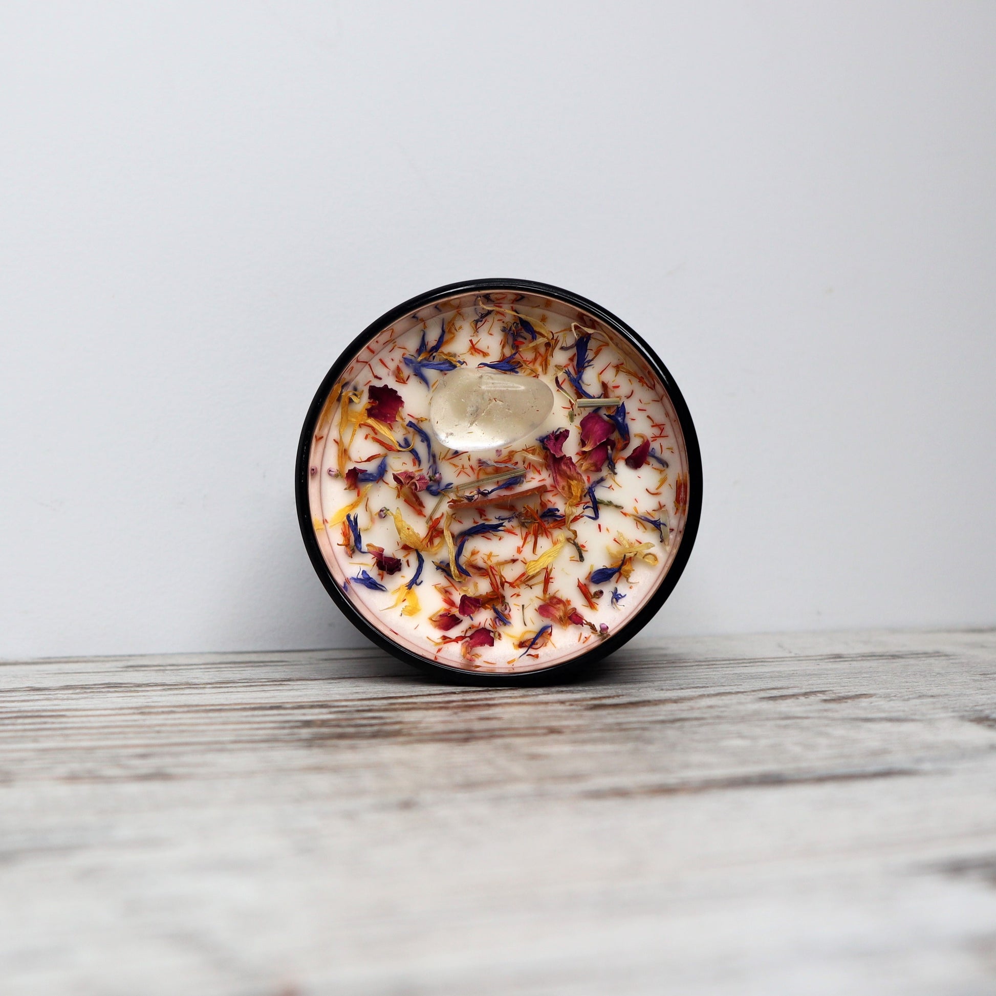 This tranquil blend features grounding notes of sandalwood and musk, uplifted by fresh mandarin, bergamot, violet, and jasmine petals. A beautiful mix of dried botanicals — including lavender, calendula, safflower, cornflower, and heather flowers — adds depth and texture, while a hand-selected Clear Quartz tumble infuses the candle with clarity, harmony, and amplified intention.