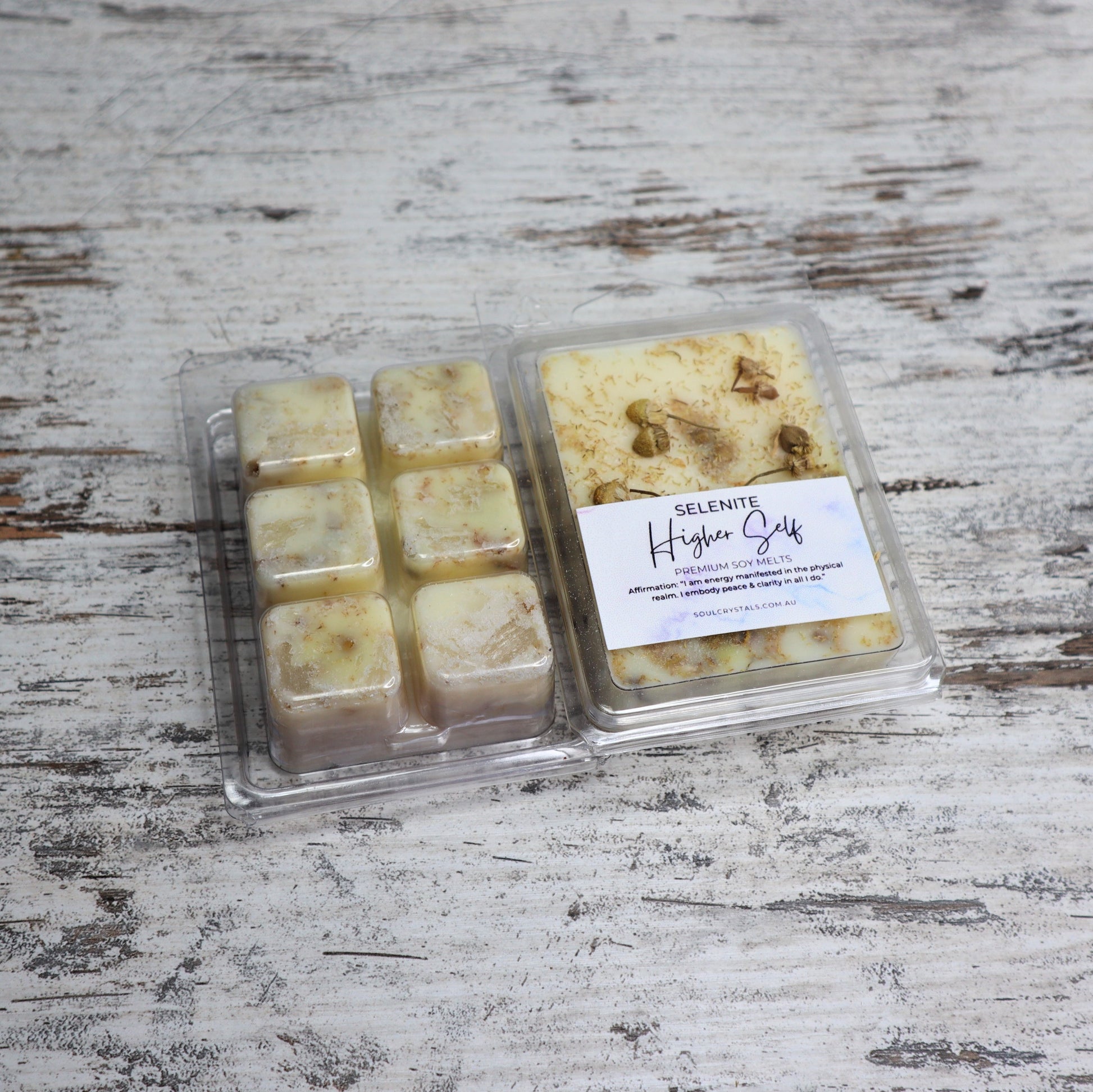 Infused with a bright, soul-refreshing blend of pomegranate, lemon, lime, pineapple, and jasmine, these melts create an atmosphere of clarity, peace, and spiritual alignment. Organic chamomile flowers are scattered throughout each bar, complemented by Selenite crystal chips — known for their cleansing and high-frequency energy that supports spiritual awakening and connection to higher realms.