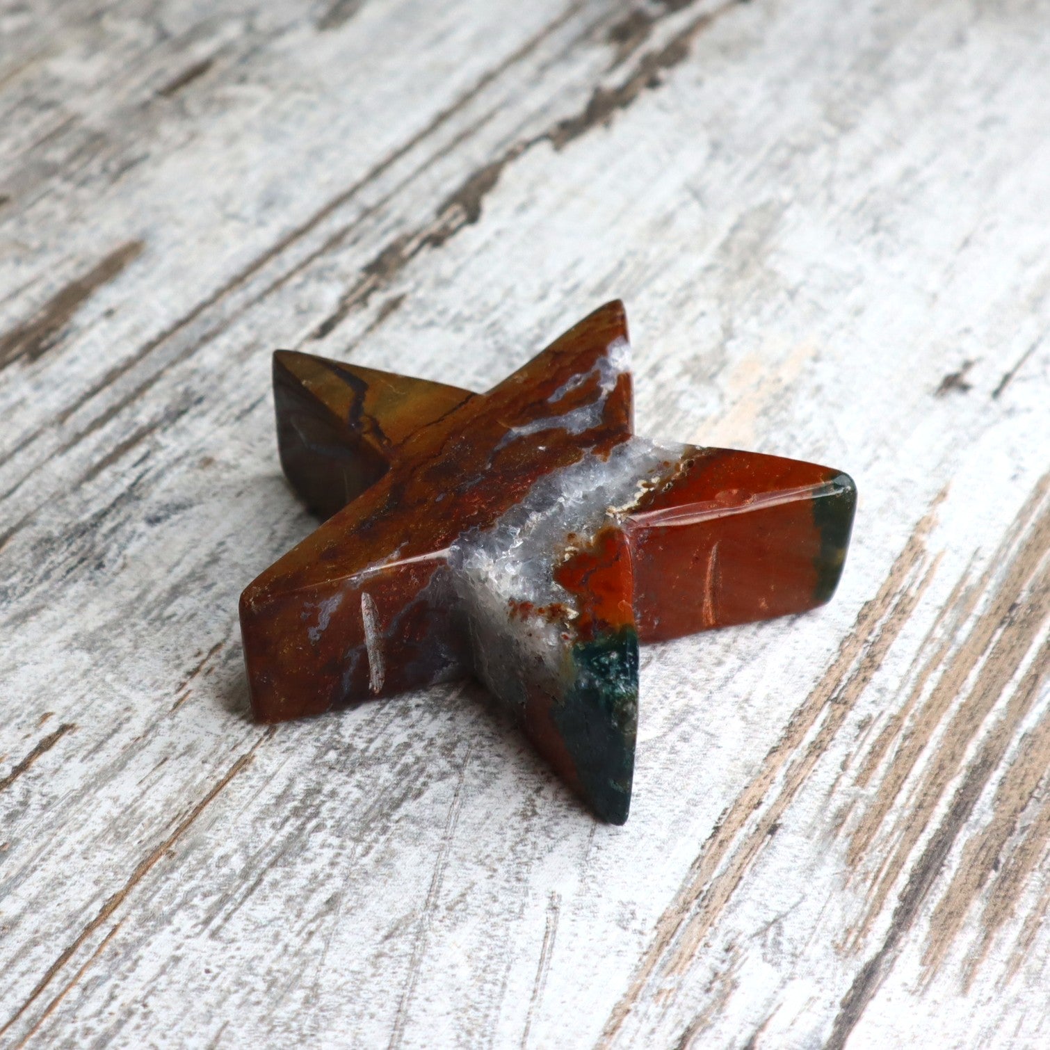 Polished Jasper star carving – approx. 305g | 11cm wide – featuring deep reds, warm browns, and creamy bands with quartz sparkle throughout