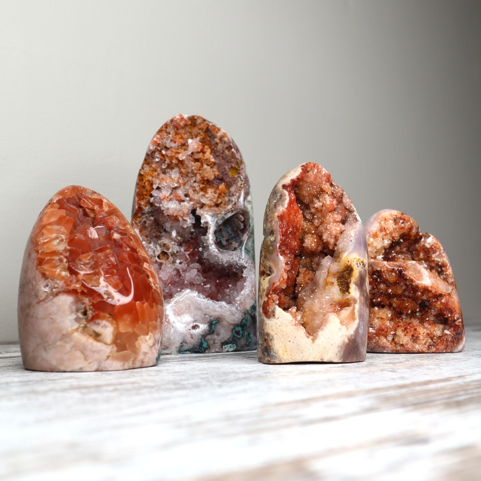 – Stunning polished freeform with fiery peach-blush crystal patterning