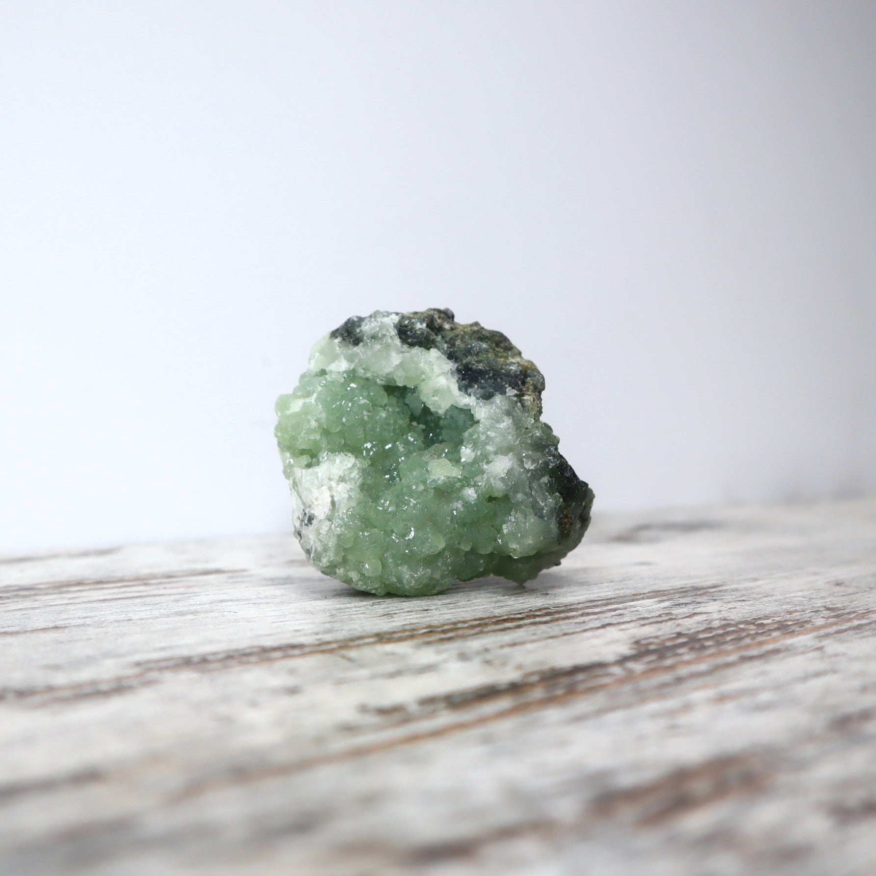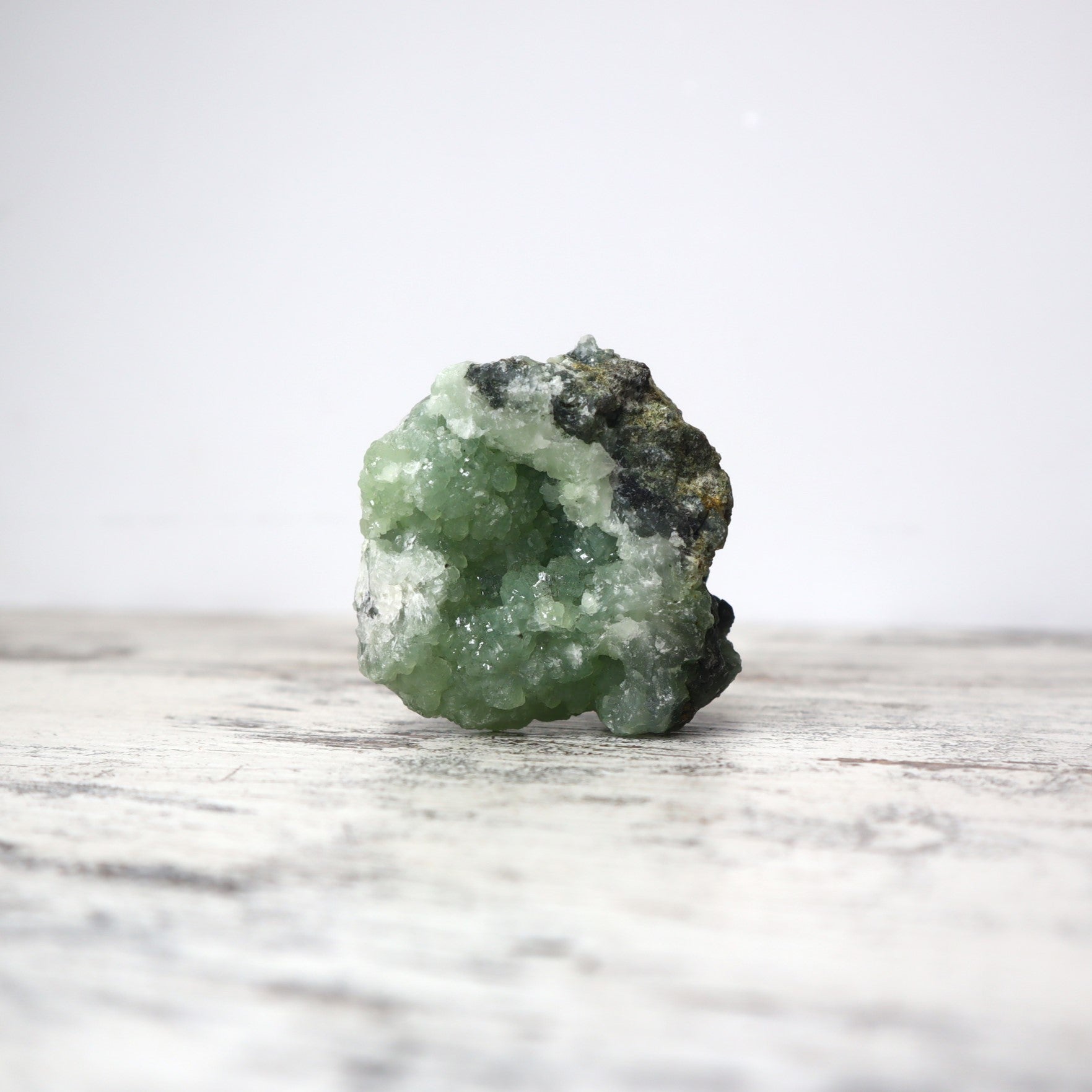 This beautiful raw specimen glows with soft green light and shimmers with natural sparkle, offering gentle heart-healing energy and a nurturing presence. Prehnite is known as the stone that heals the healer — connecting you to divine guidance, while calming the emotional body and encouraging trust in the universe.