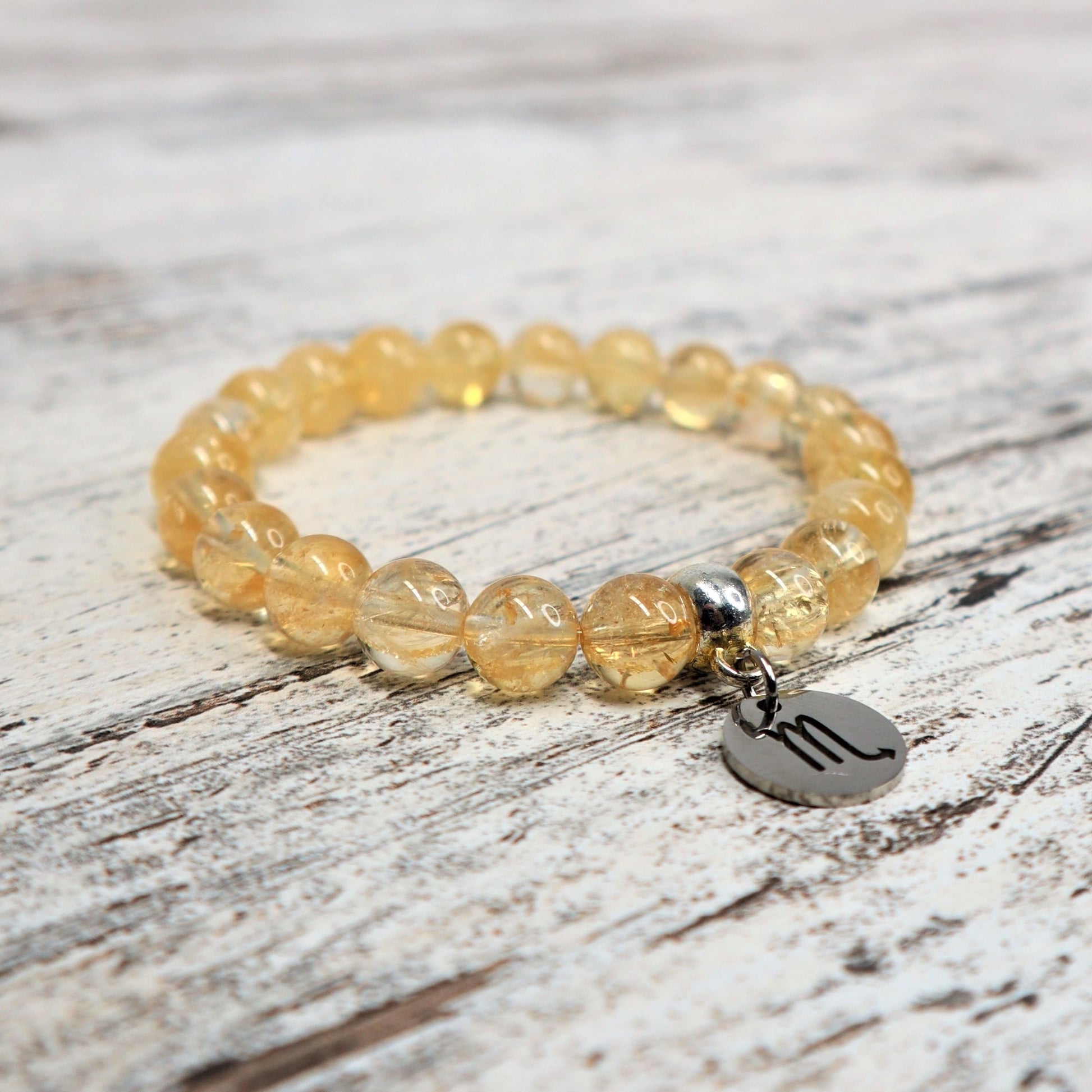 Our beautiful Scorpio Bracelet is lovingly made with 8mm Citrine Beads on strong elastic cord and finished with a 12mm Stainless Steel Zodiac Charm.