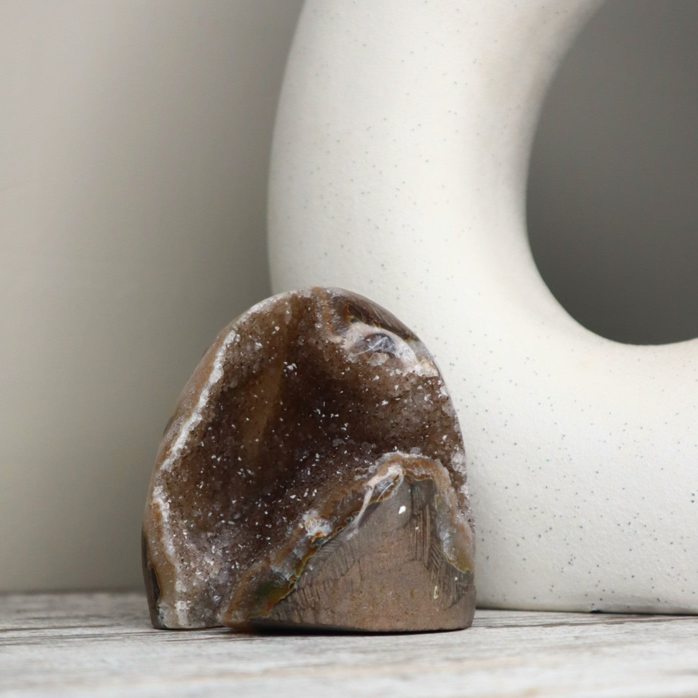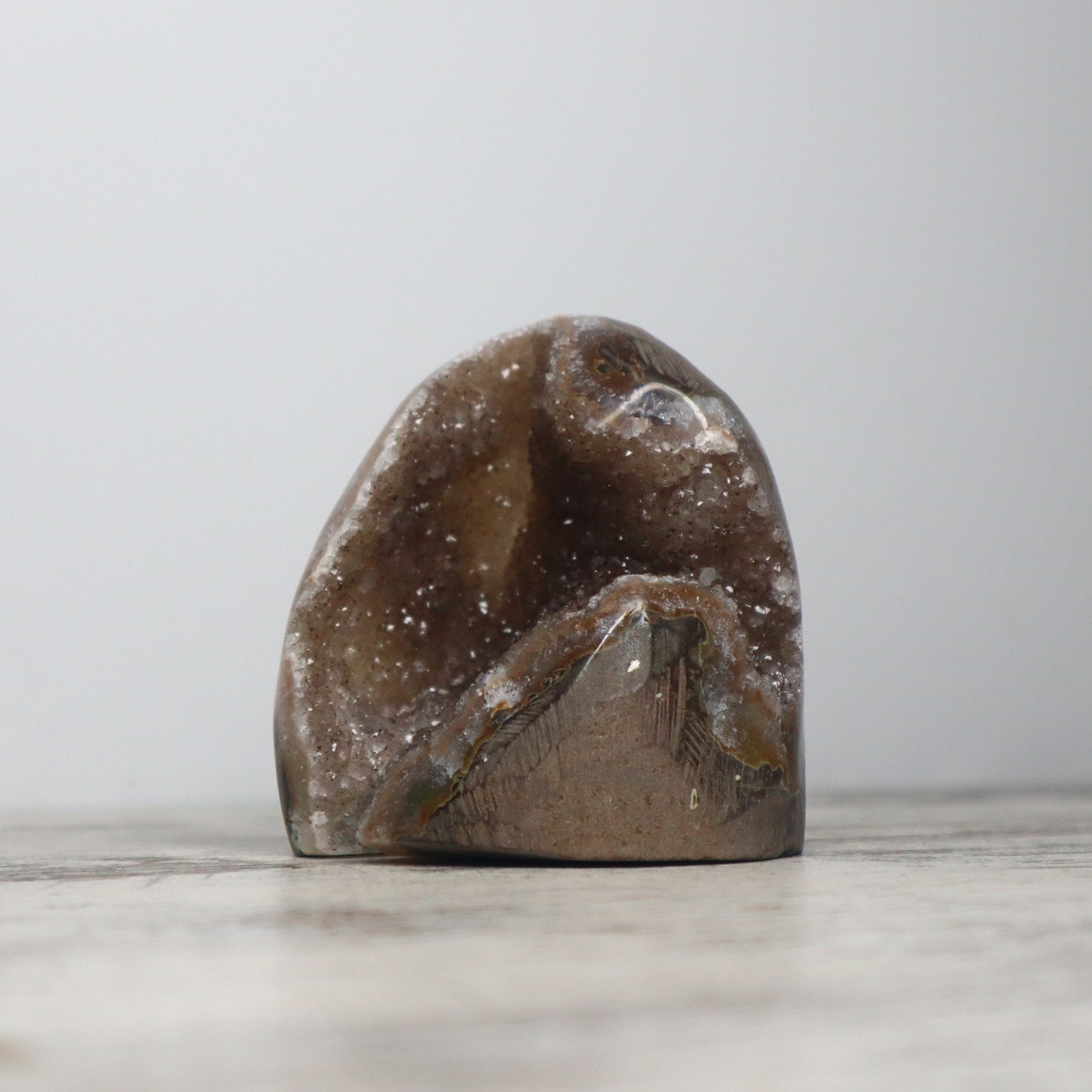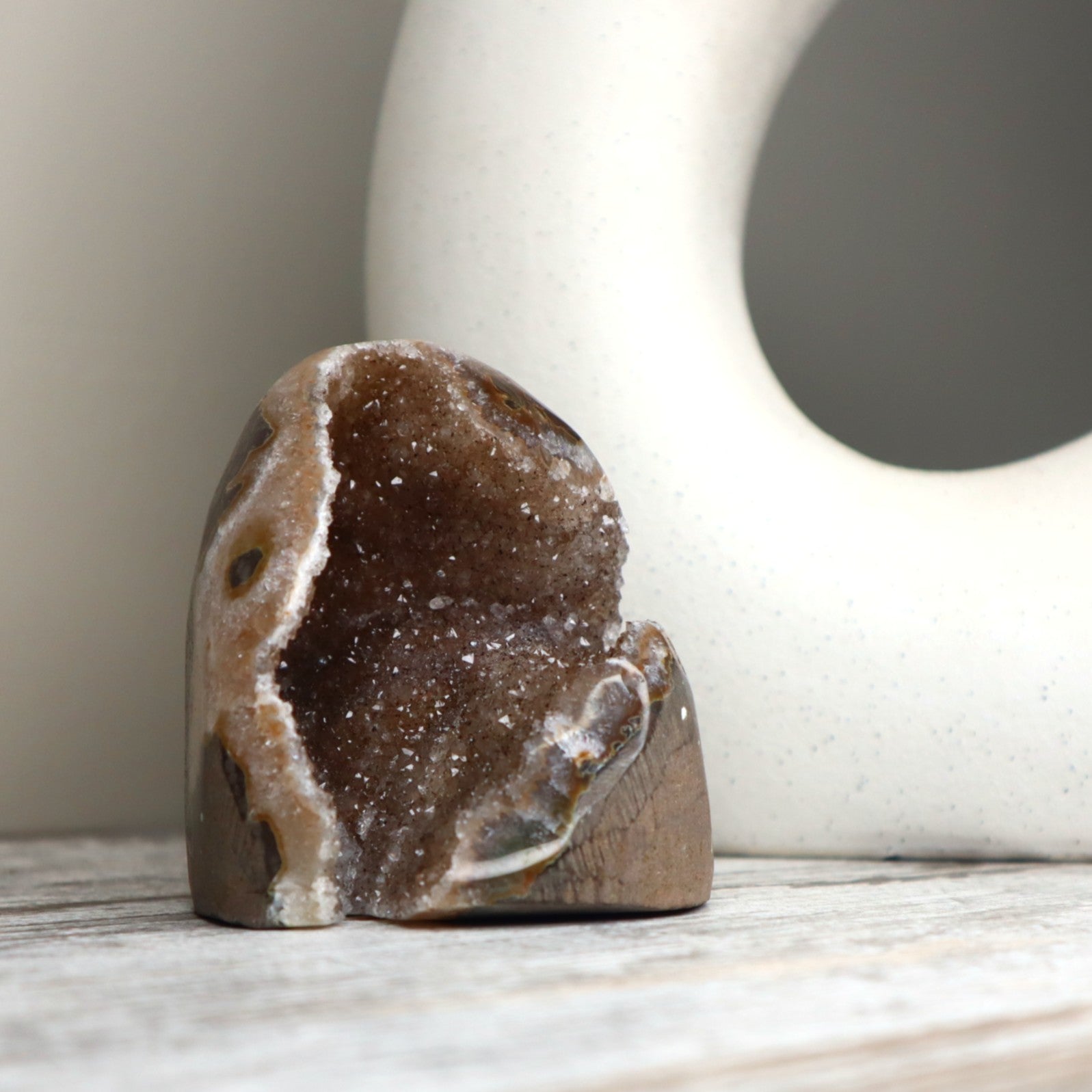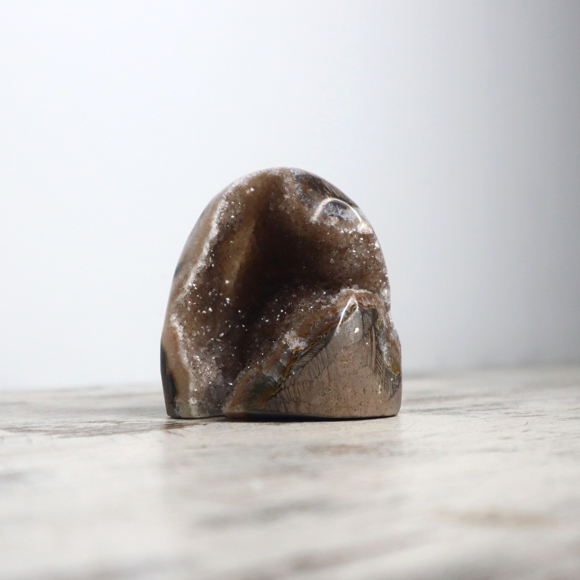 Smokey Amethyst Cave (Cut Base):** approx. 9cm tall / 576g – shimmering druzy interior with earthy tones