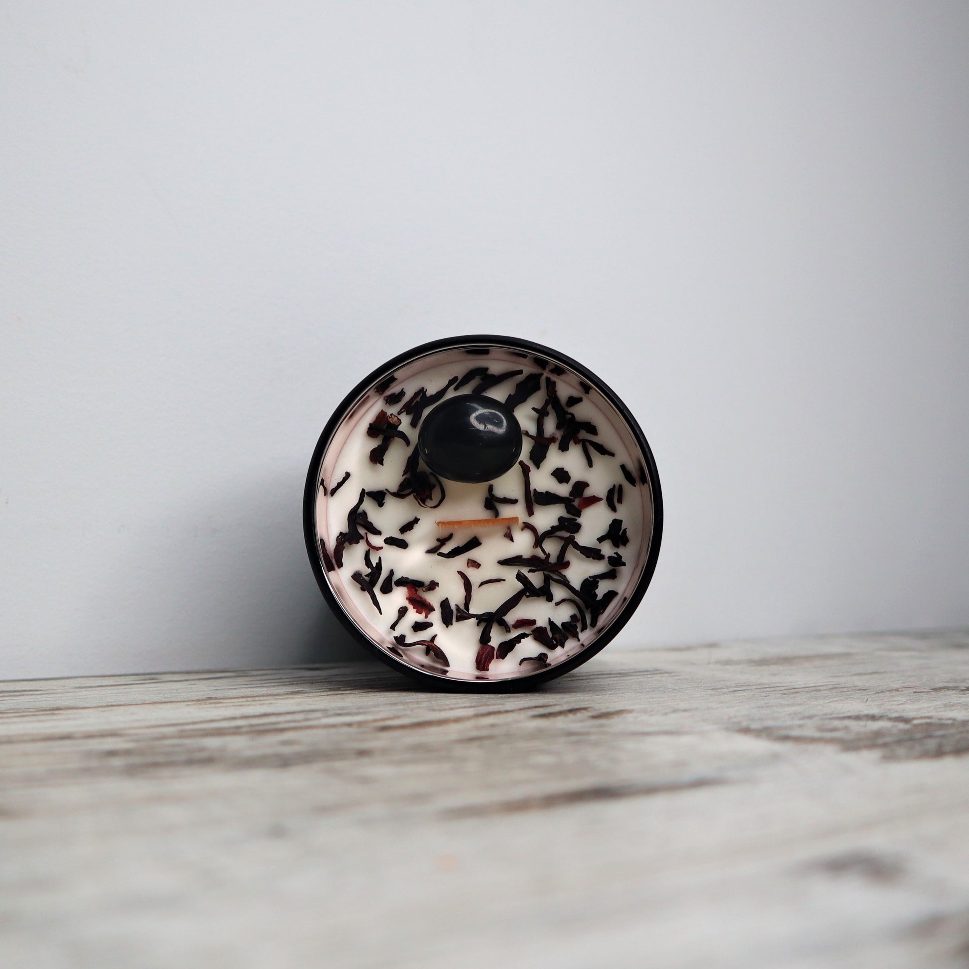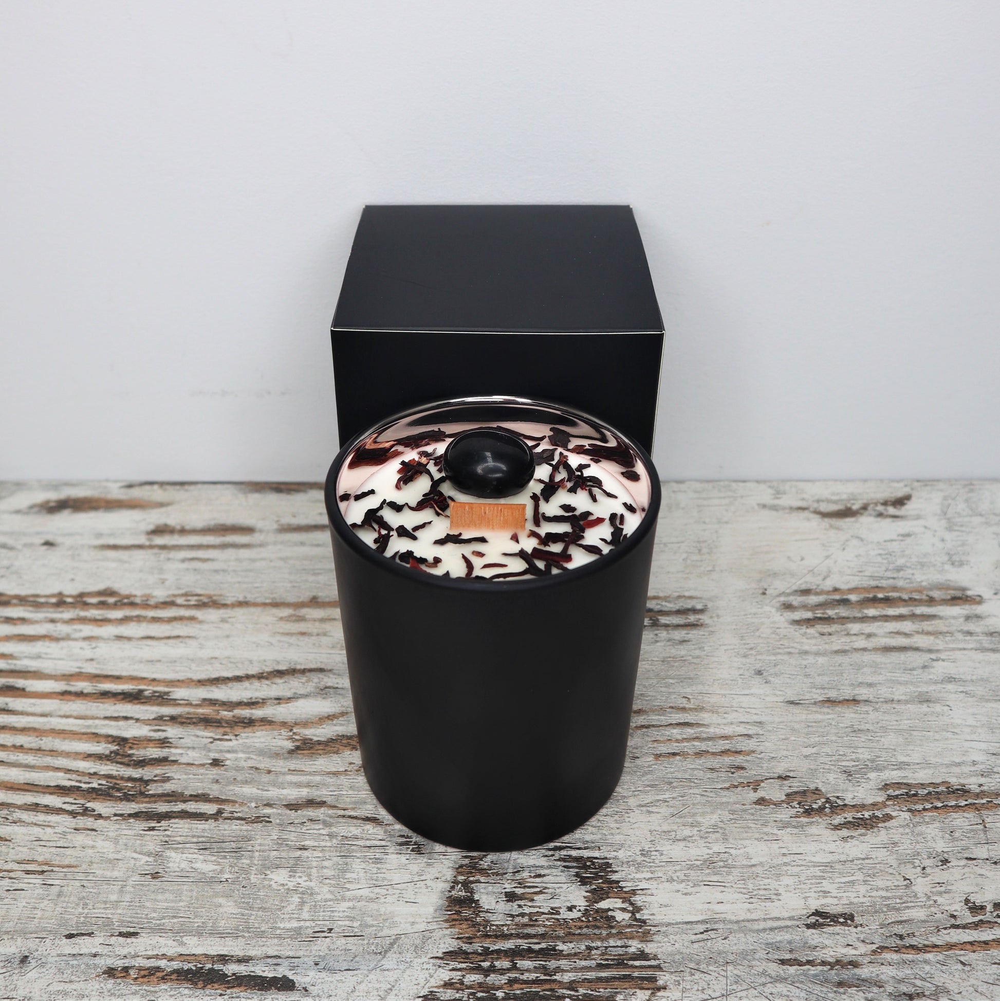Infused with a powerful blend of Lily of the Valley, Hawthorne Blossoms, Geranium, Cranberry, Fig, Grapefruit, and Blood Orange, this grounding floral-citrus fragrance is bold yet balancing. Dried hibiscus petals lend a purifying botanical touch, while a hand-selected Black Tourmaline tumble is embedded within — a crystal known for its potent protection, energetic shielding, and grounding properties.
